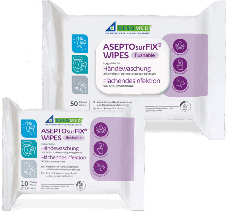 ASEPTOsurFIX WIPES sind gut geeignet für die hygienische Händewaschung sowie zur Desinfektion von Oberflächen wie Toilettensitzen oder Smartphones. Die Tücher sind biologisch abbaubar und können einfach über die Toilette entsorgt werden.