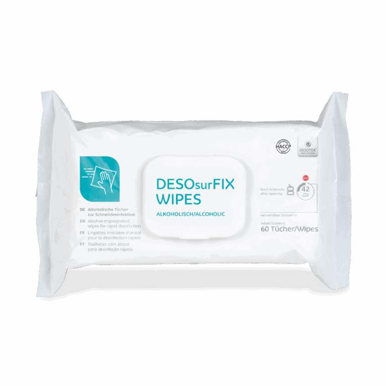 Flächen mit DESOsurFIX WIPES bis zur vollständigen Benetzung abwischen und über die gesamte Einwirkzeit feucht halten. Sichtbare Verschmutzungen sind vor der Desinfektion zu entfernen.